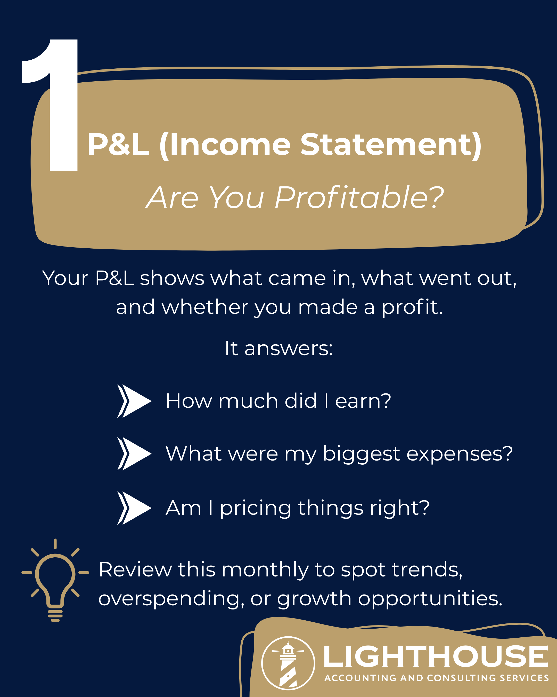 The profit and loss statement shows whether your business is actually making money during a specific period. Reviewing it monthly helps you track revenue, expenses, and margins before issues compound. Profitability is essential, but it’s only one part of the picture.