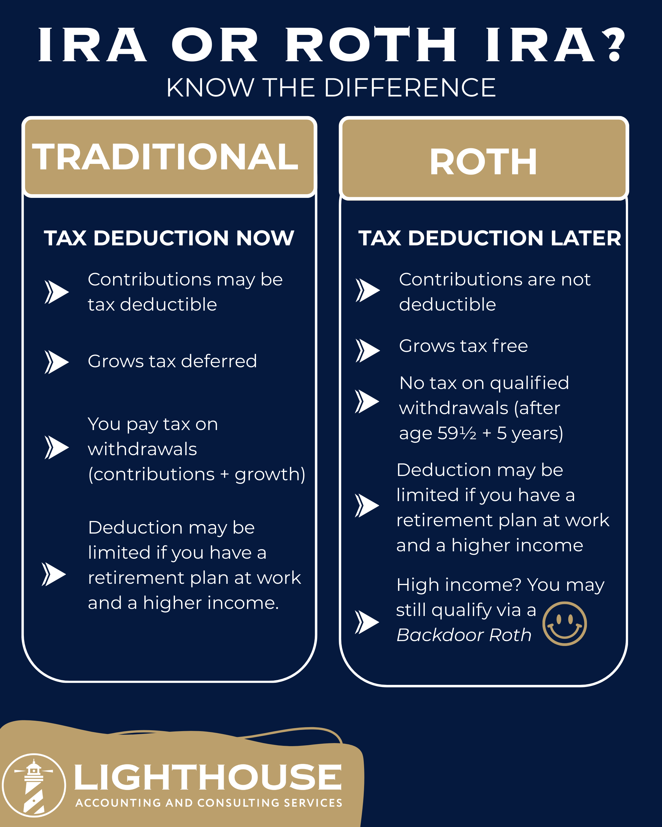 Choosing between a Traditional IRA and a Roth IRA isn’t about which one is “better” — it’s about when you want the tax benefit. Traditional IRAs may offer a tax deduction today, while Roth IRAs provide tax-free growth and withdrawals later, assuming eligibility rules are met. The right choice depends on income level, current tax rate, and long-term planning goals.